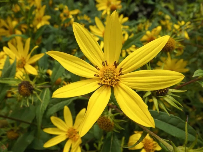 Flowers: bright yellow 2 - 3 inches wide flowers that are daisy like with dark centres (middle).