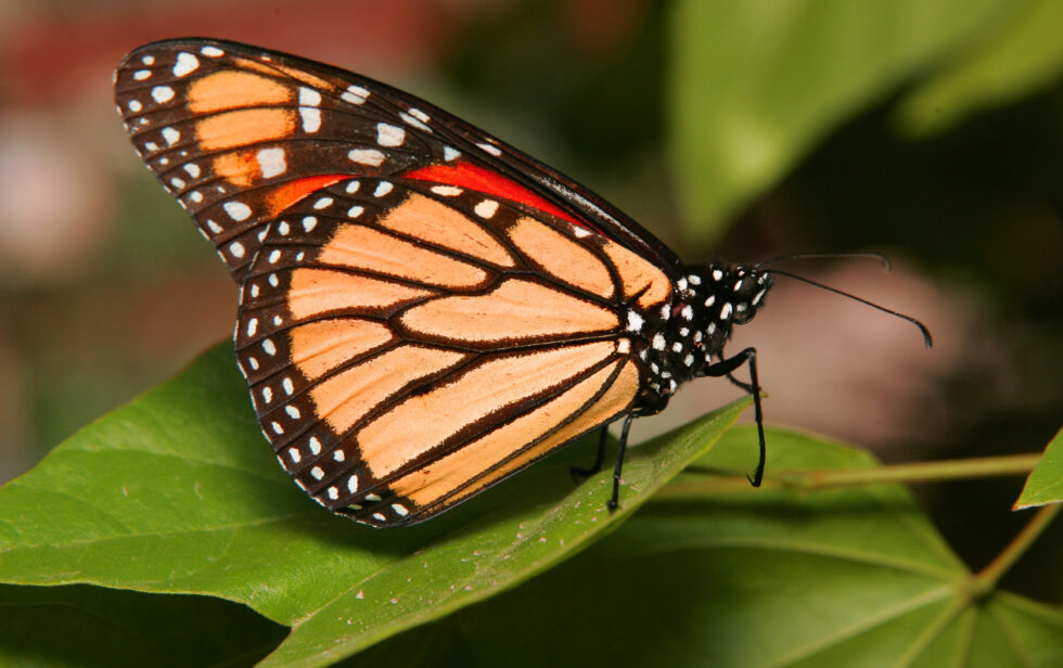 Monarch resting on a green leaf with their wings closed. Photo Credits: Garden Blog / DESERT BOTANICAL Garden