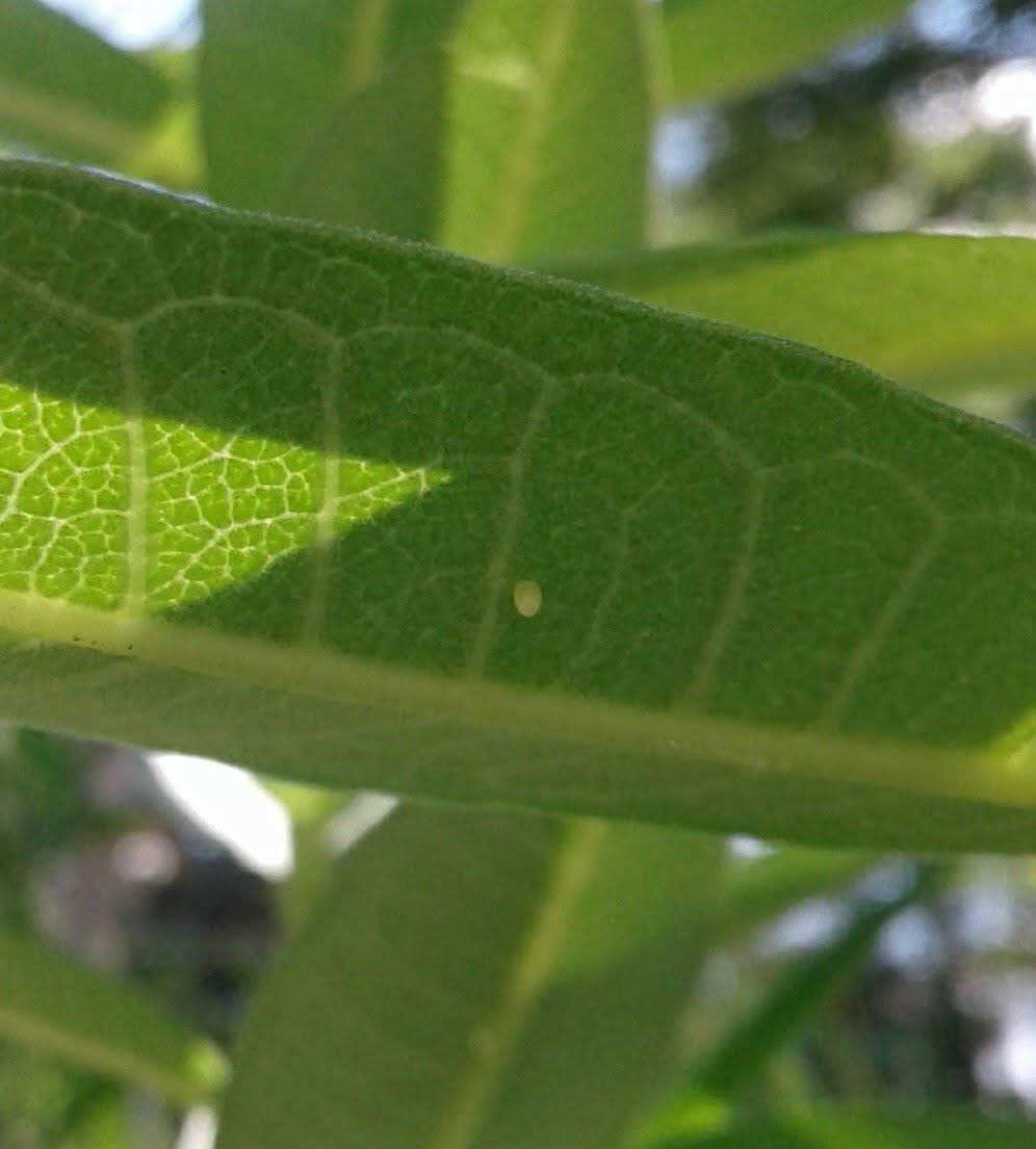 A Monarch Egg on the underside of a Common Milkweed leaf. Photo Credits: Jennifer Doolan from The Ontario Native Plant Gardening Group on Facebook
