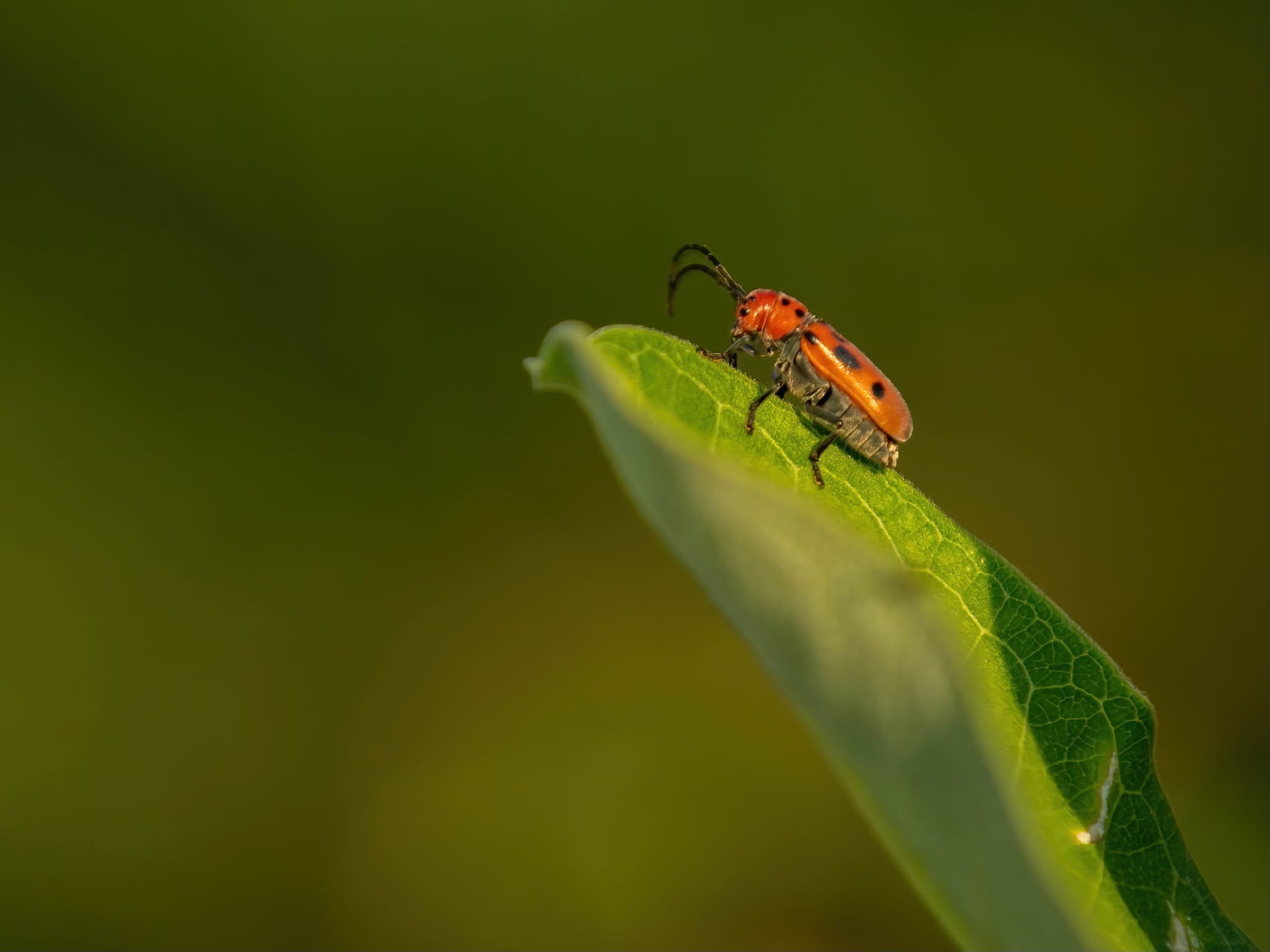 Red Milkweed Beetle at the tip of a Common Milkweed leaf. Photo Credits: Nancy Steed Wilcox from The Ontario Native Plant Gardening Group on Facebook