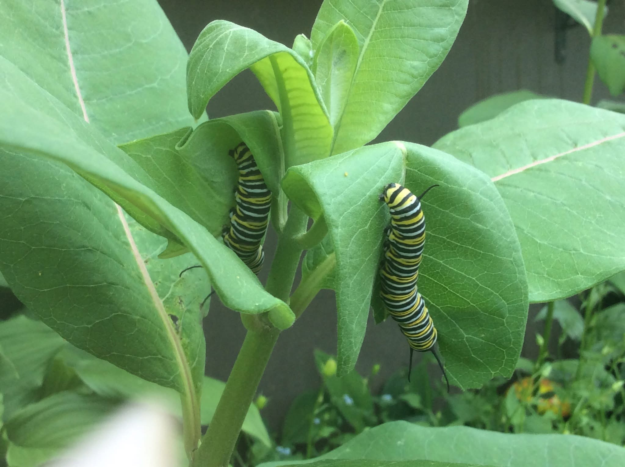 Two mature Monarch Caterpillars on Common Milkweed. Photo Credits: Lenore Marginet from The Ontario Native Plant Gardening Group on Facebook