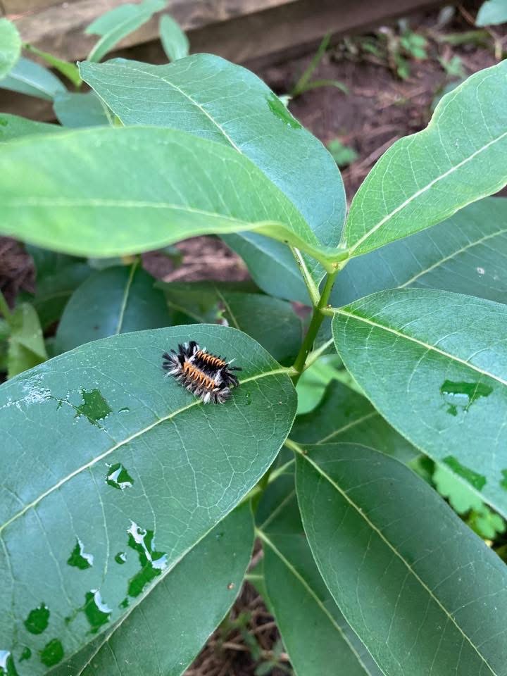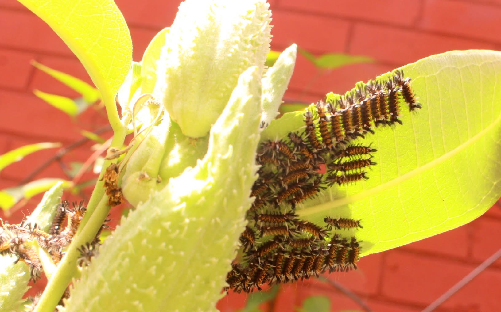 A large brood of Milkweed Tussock Moth Caterpillars on the underside of a Common Milkweed leaf. Photo Credits: Alison Gauvin from The Ontario Native Plants Gardening Group on Facebook