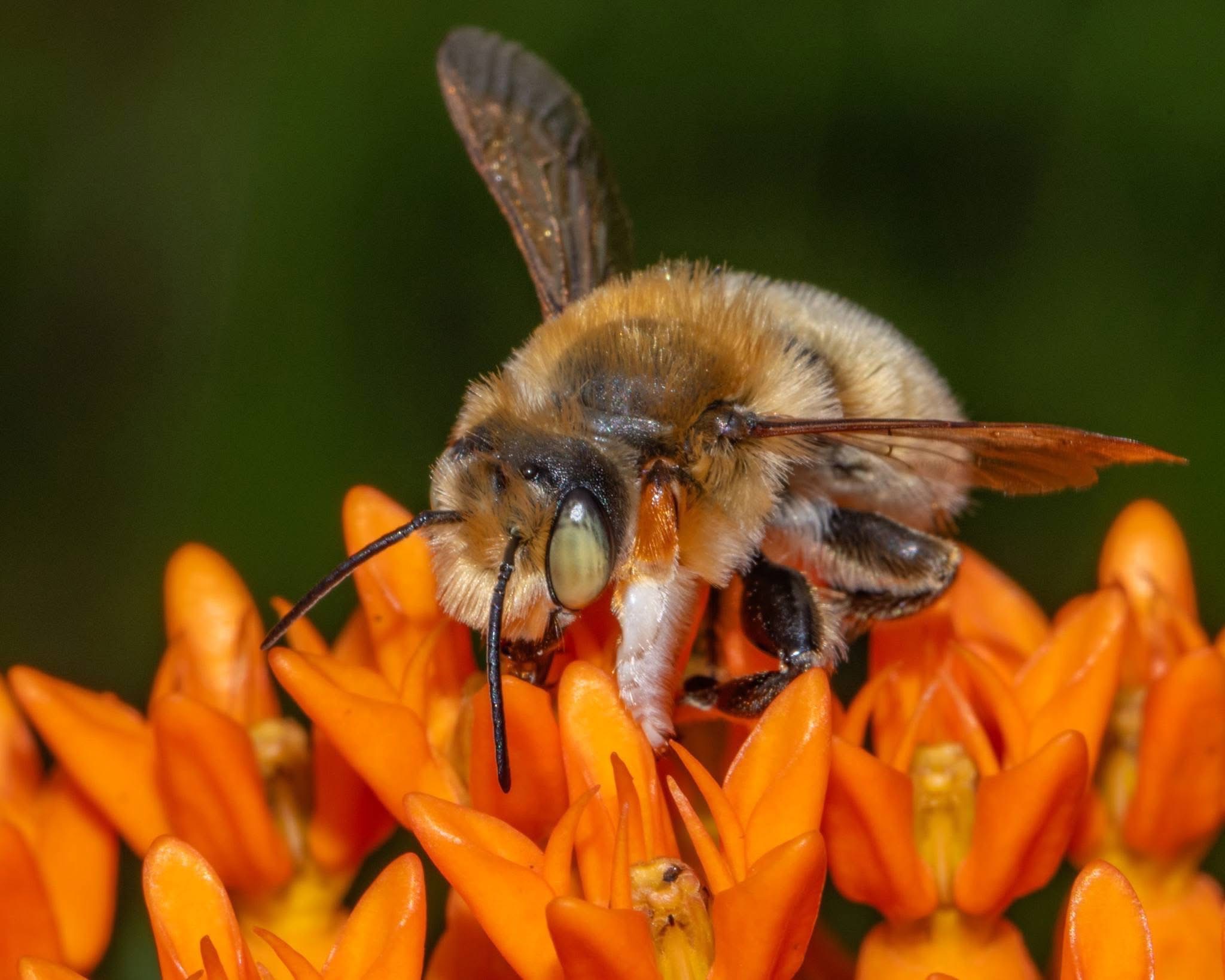Broad - handed Leaf cutter Bee on Butterfly Milkweed flowers. Photo Credits: Bob Noble from The Ontario Native Plant Gardening Group on Facebook