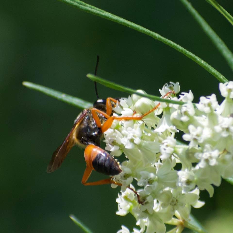 A Golden Digger Wasp pollinating the flowers on a Whorled Milkweed Plant. Photo Credits: Lisa Massie from The Ontario Native Plant Gardening Group on Facebook