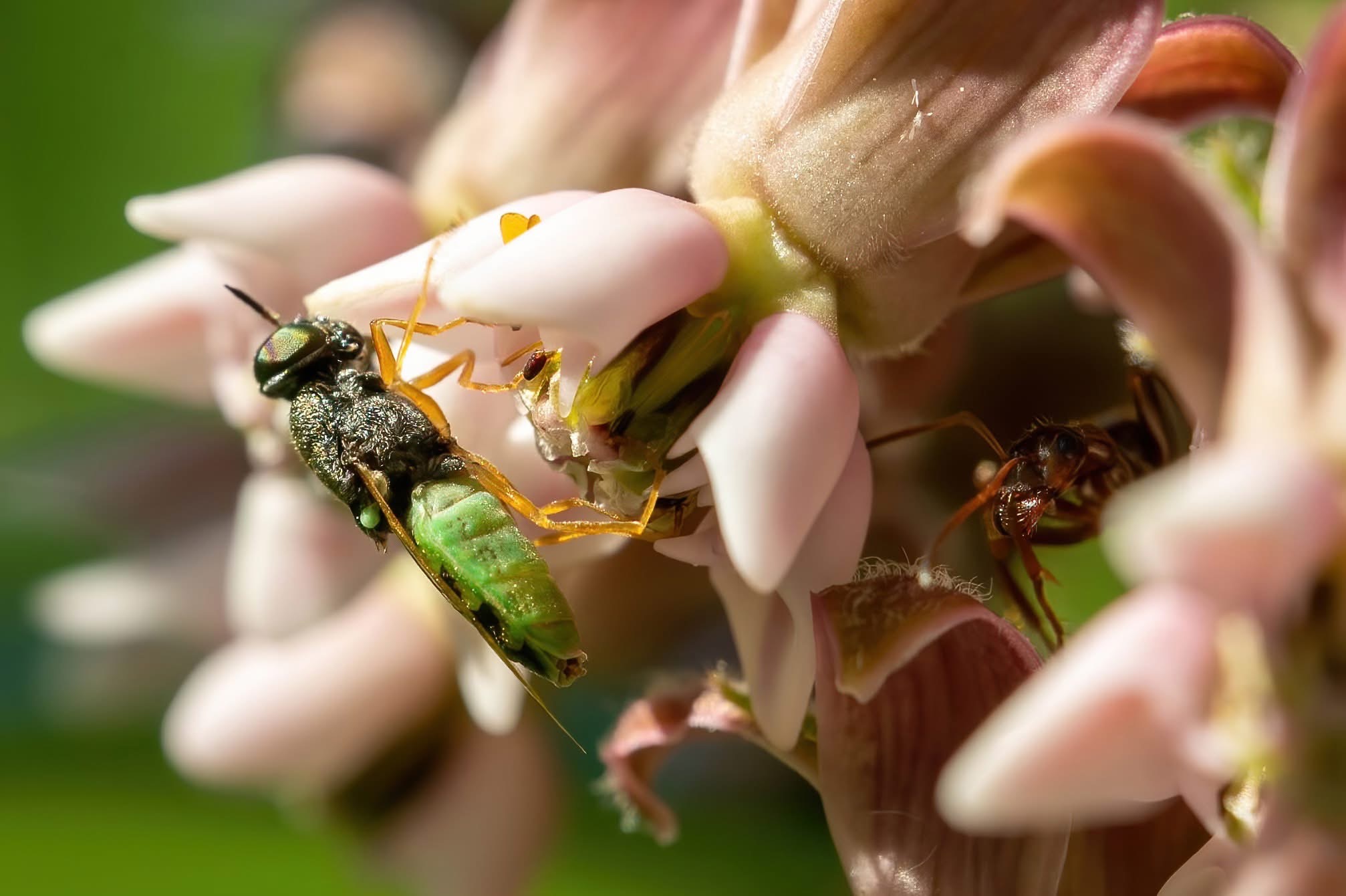 A Solider Fly and an Ant on the flowers of a Common Milkweed Plant. Photo Credits: Nancy Steed Wilcox from The Ontario Native Plant Gardening Group on Facebook
