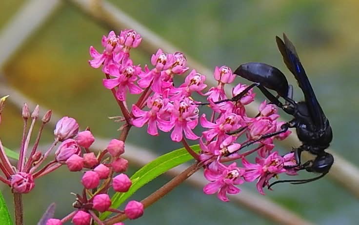 A Great Black Wasp sipping nectar from the flowers on a Swamp Milkweed Plant. Photo Credits: Alison Gauvin from The Ontario Native Plant Gardening Group on Facebook