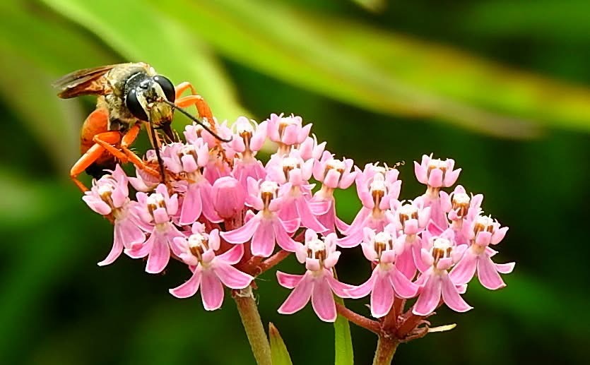 A Golden Digger Wasp sipping nectar from the flowers on a Swamp Milkweed Plant. Photo Credits: Alison Gauvin from The Ontario Native Plant Gardening Group on Facebook