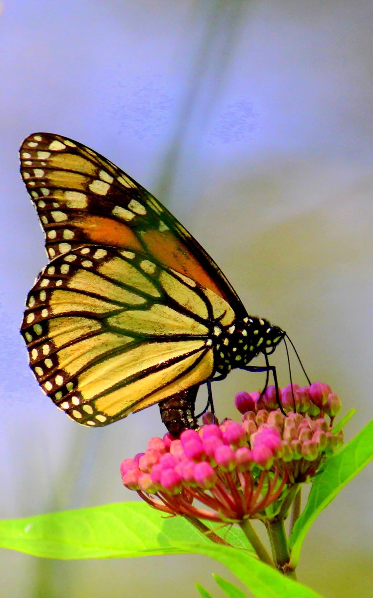 A Monarch Butterfly relaxing and sipping nectar on flowers of a Butterfly Weed Plant.
