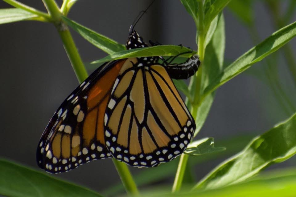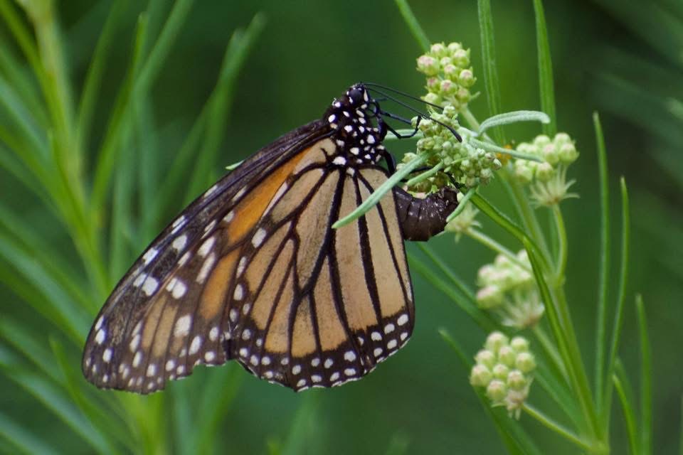 A female Monarch Butterfly depositing one of eggs on Whorled Milkweed. Photo Credits: Lisa Massie from The Ontario Native Plants Gardening Group on Facebook