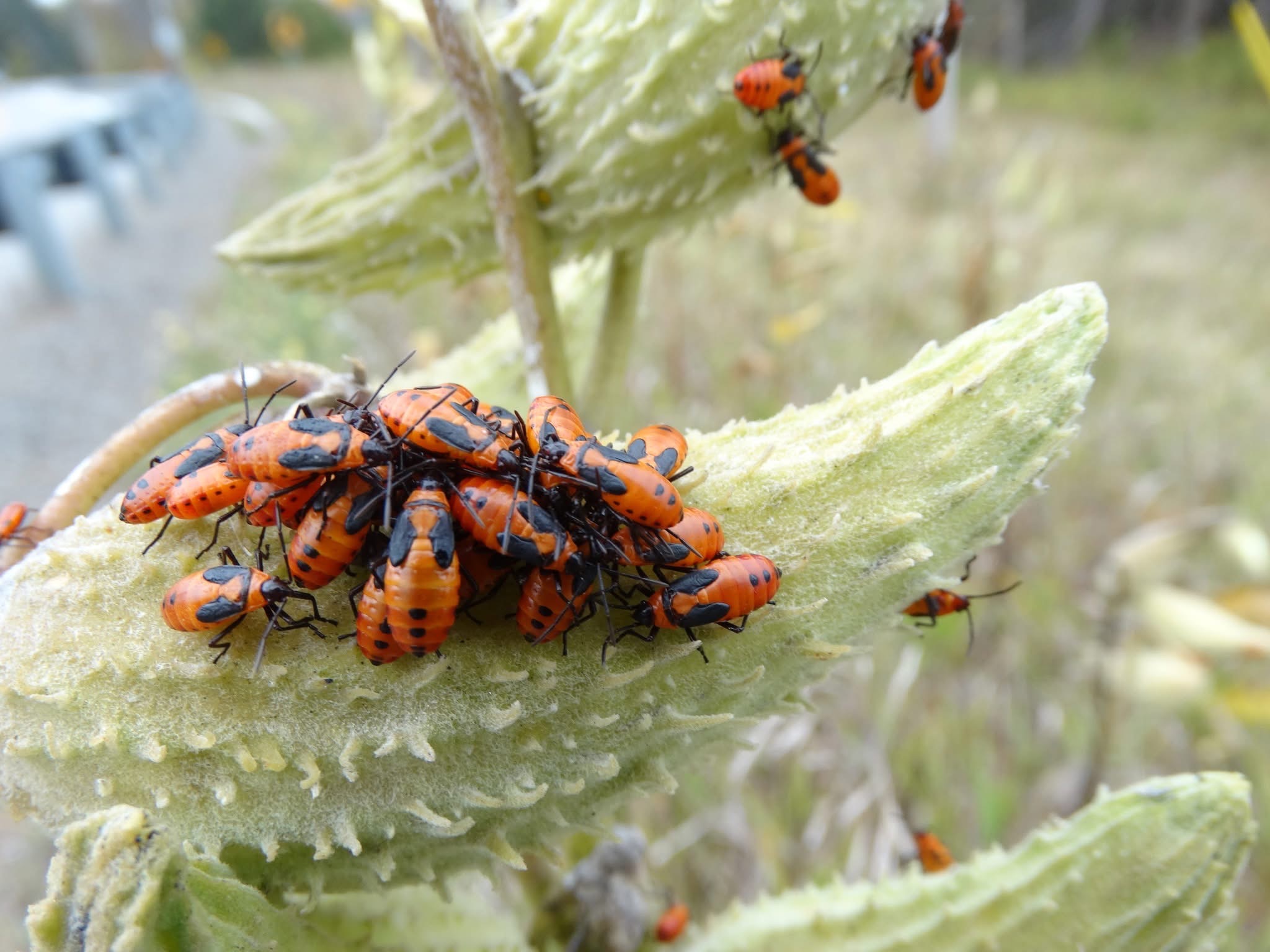 A small pile of Milkweed Bug’s Nymphs on a Common Milkweed Seed Pod. Photo Credits: Marlene Knezevich from The Ontario Native Plants Gardening Group on Facebook