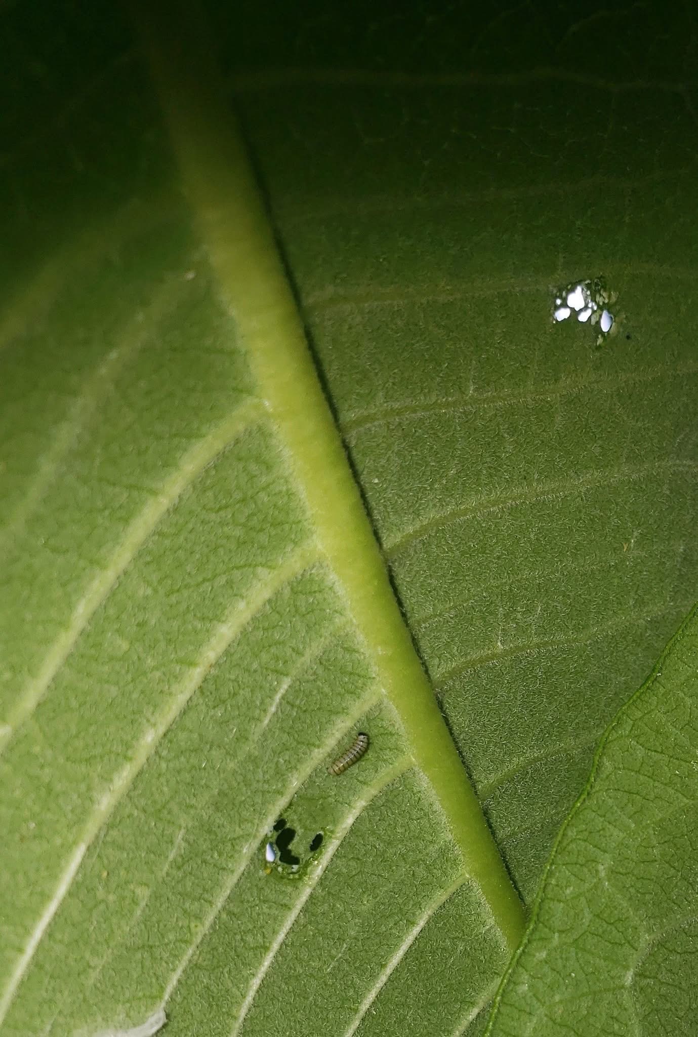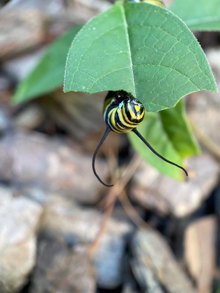 A baby Monarch Caterpillar on the underside of a Common Milkweed leaf. Photo Credits: Jennifer Doolan from The Ontario Native Plants Gardening Group on Facebook