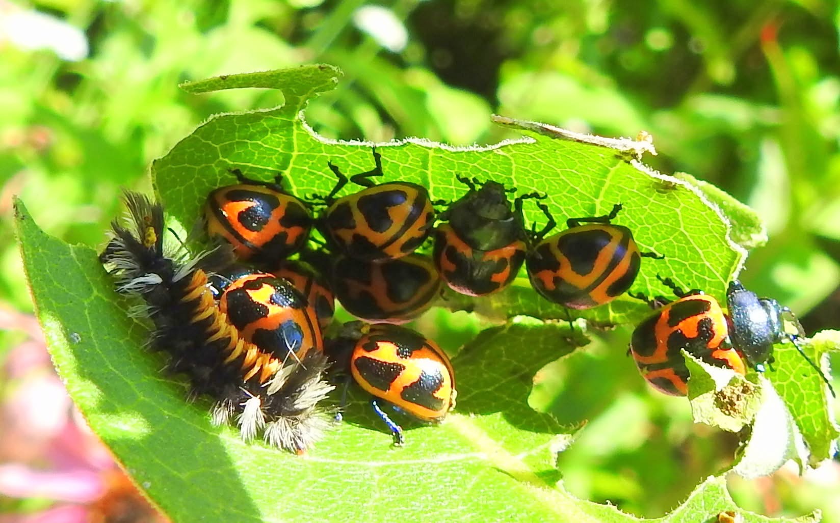 Nine mature Swamp Milkweed leaf Beetles and a mature Milkweed Tussock Moth Caterpillar all together on the underside of a chewed Common Milkweed leaf. Photo Credits: Alison Gauvin from The Ontario Native Plants Gardening Group on Facebook