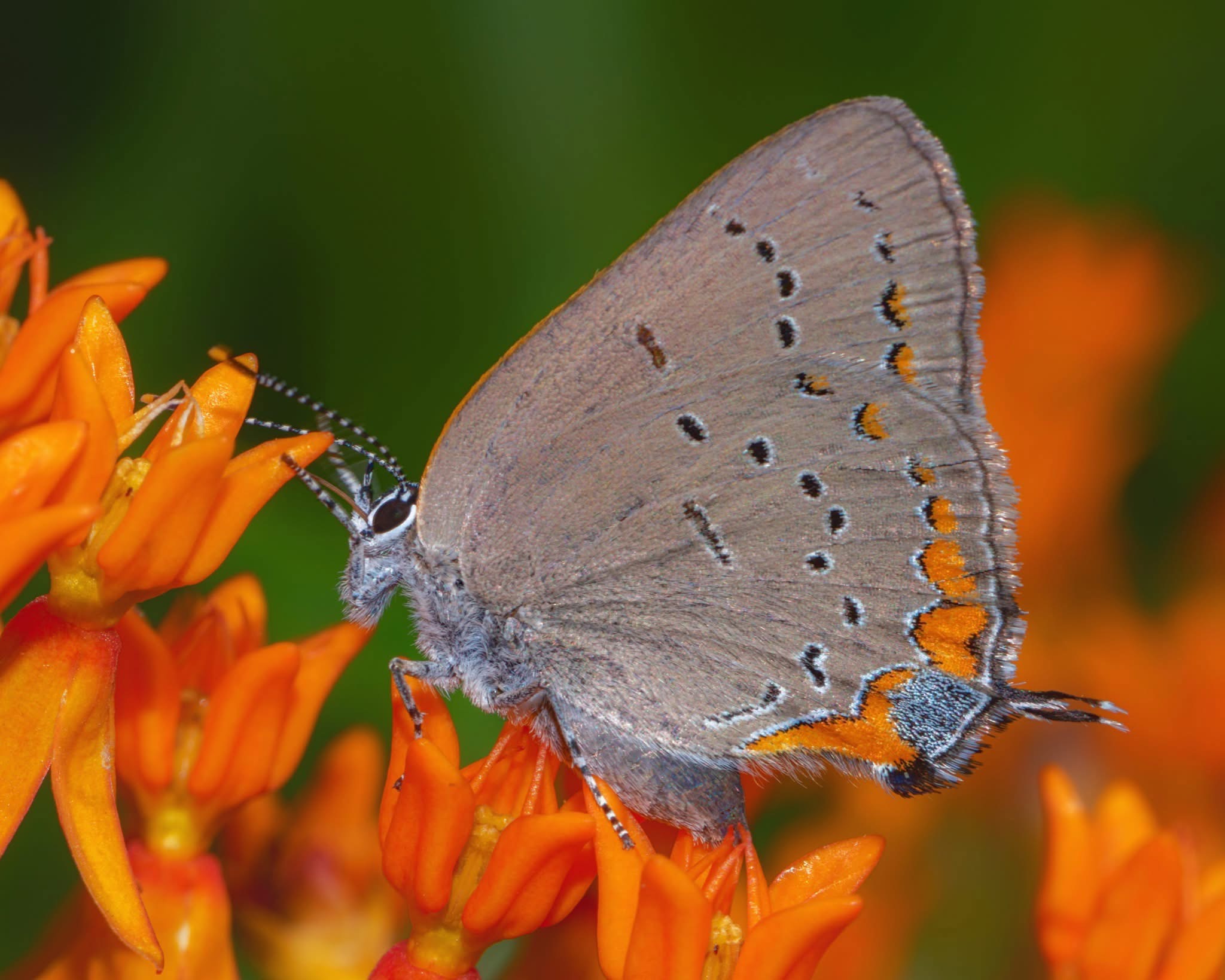 An Acadian Hairstreak resting on Butterfly Milkweed flowers. Photo Credits: Bob Noble from The Ontario Native Plants Gardening Group on Facebook