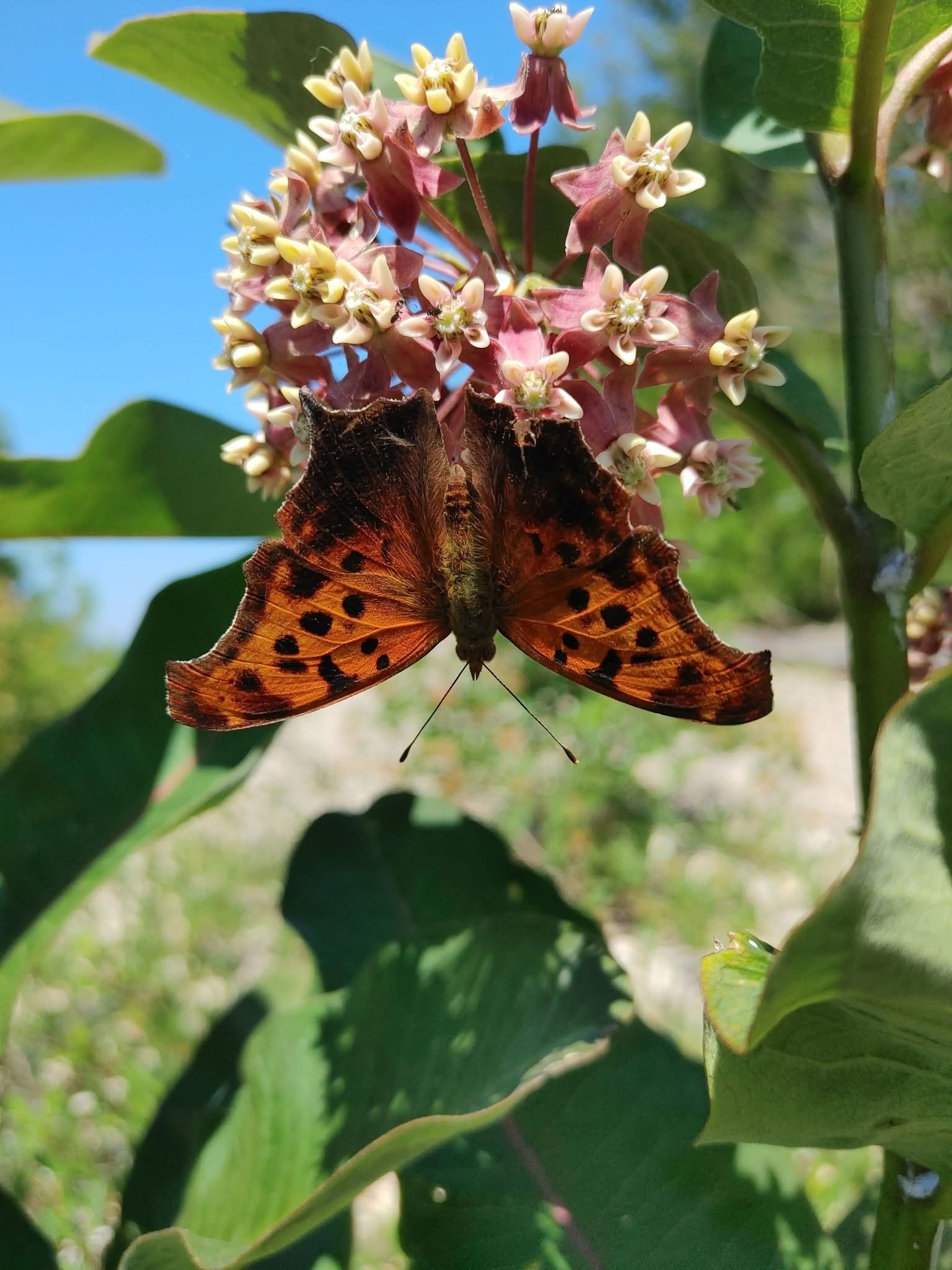 A Question Mark Butterfly on a Common Milkweed flower. Photo Credits: Caroline Breklemans from The Ontario Native Plants Gardening Group on Facebook