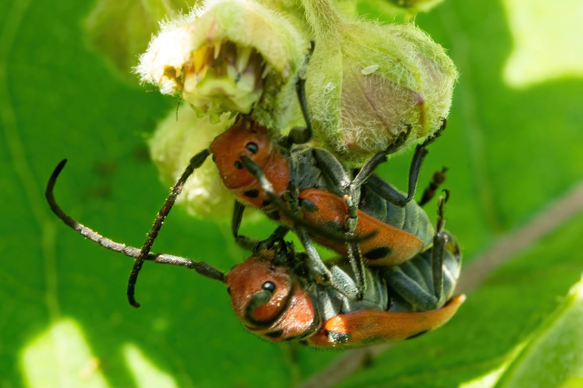 A mating pair of Red Milkweed Beetles on a cluster of Milkweed Flower Buds. Photo Credits: Nancy Steed Wilcox from The Ontario Native Plants Gardening Group on Facebook