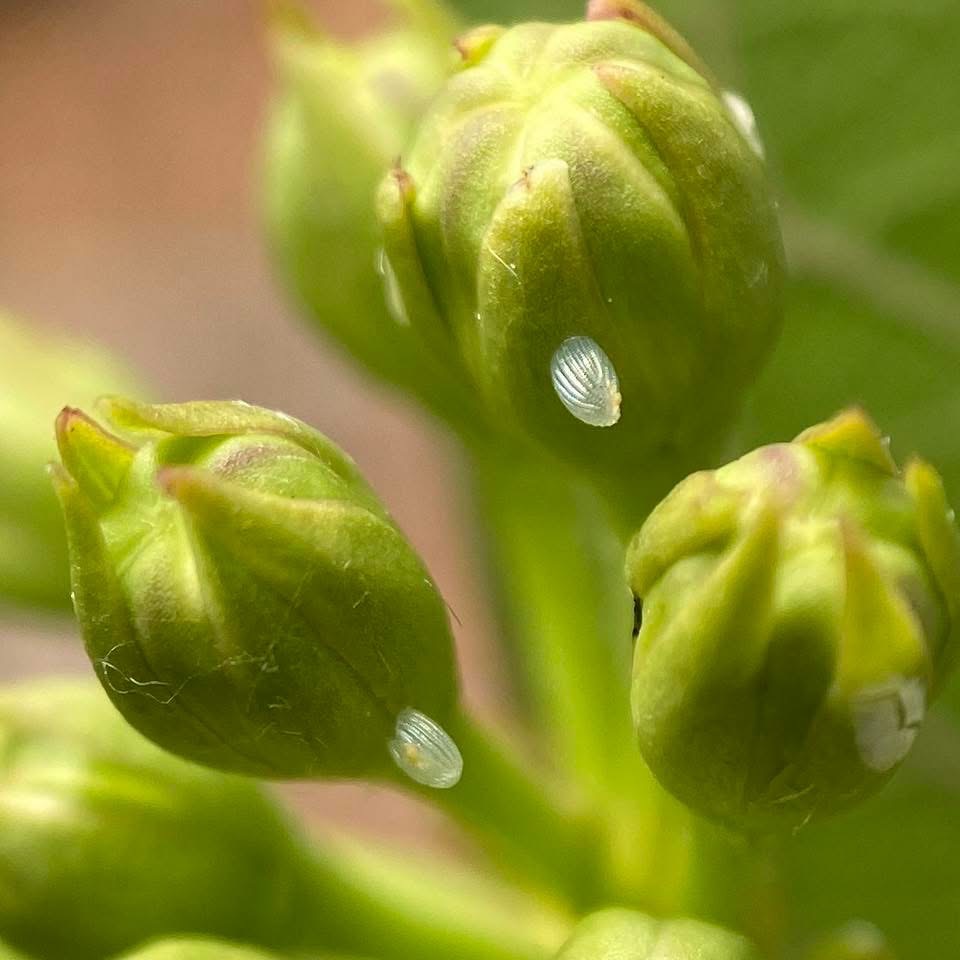 Two Monarch Butterfly eggs on Milkweed Flower Buds