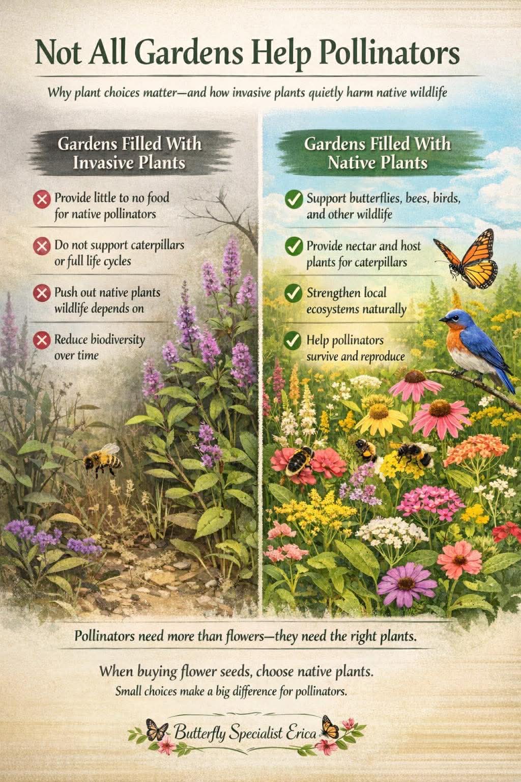 When invasive or aggressive non-native plants replace native species, these essential host plants disappear. Even if a garden looks full of blooms, it may no longer provide what specialist pollinators actually need. Nectar alone isn’t enough without the right native plants, future generations of these insects cannot survive.